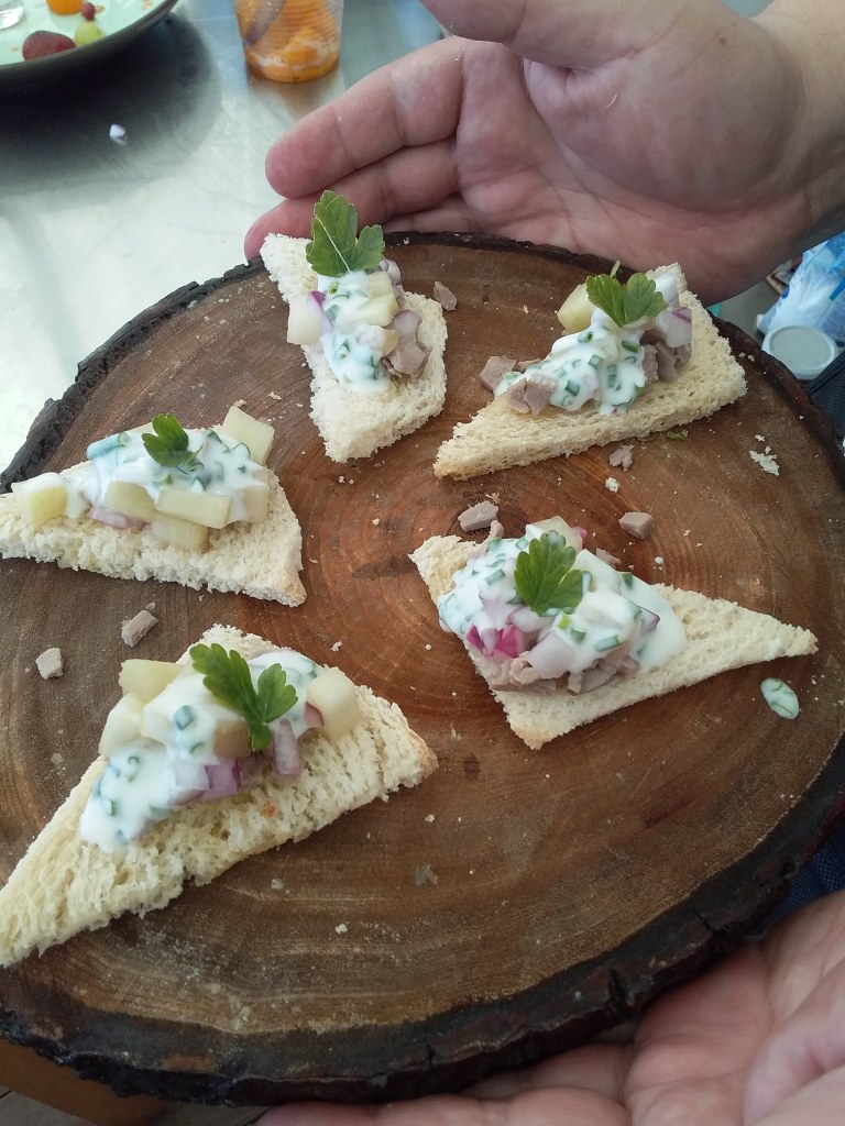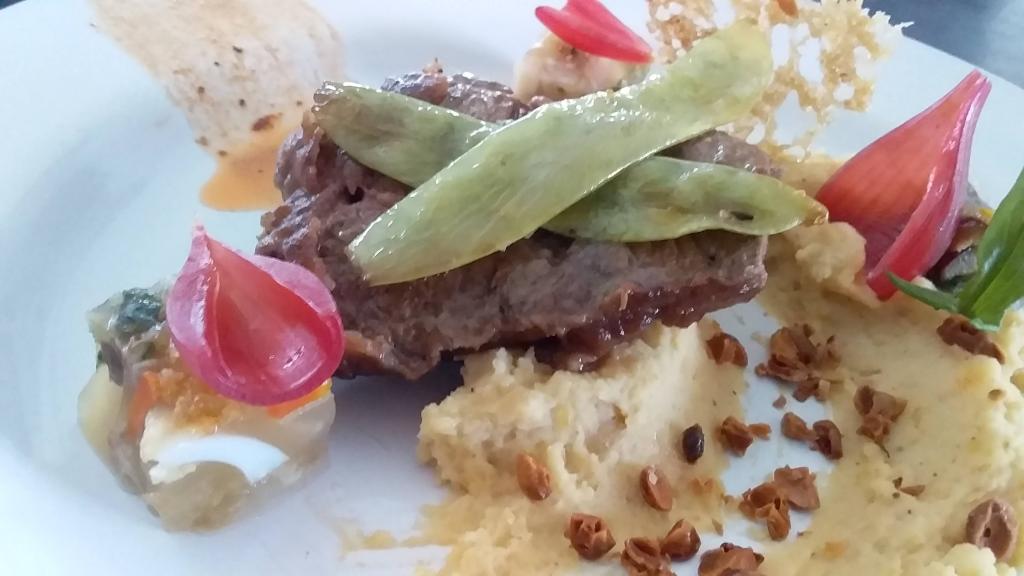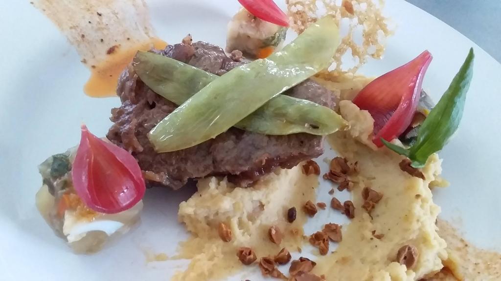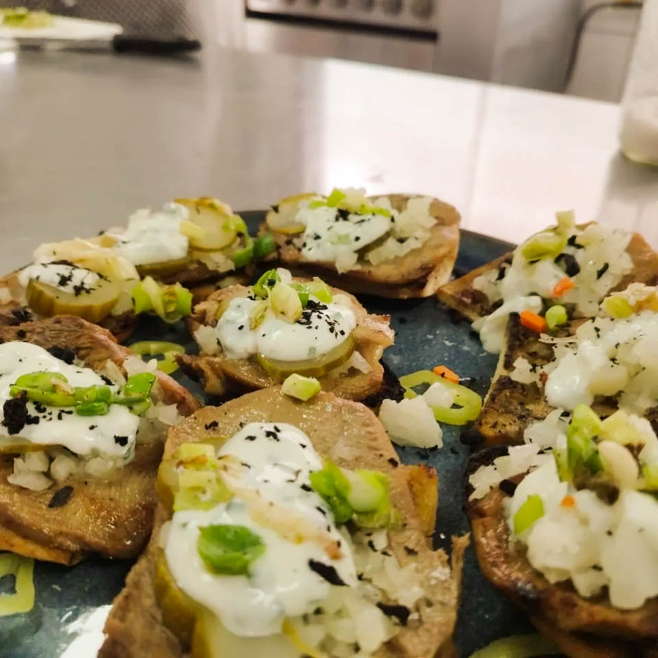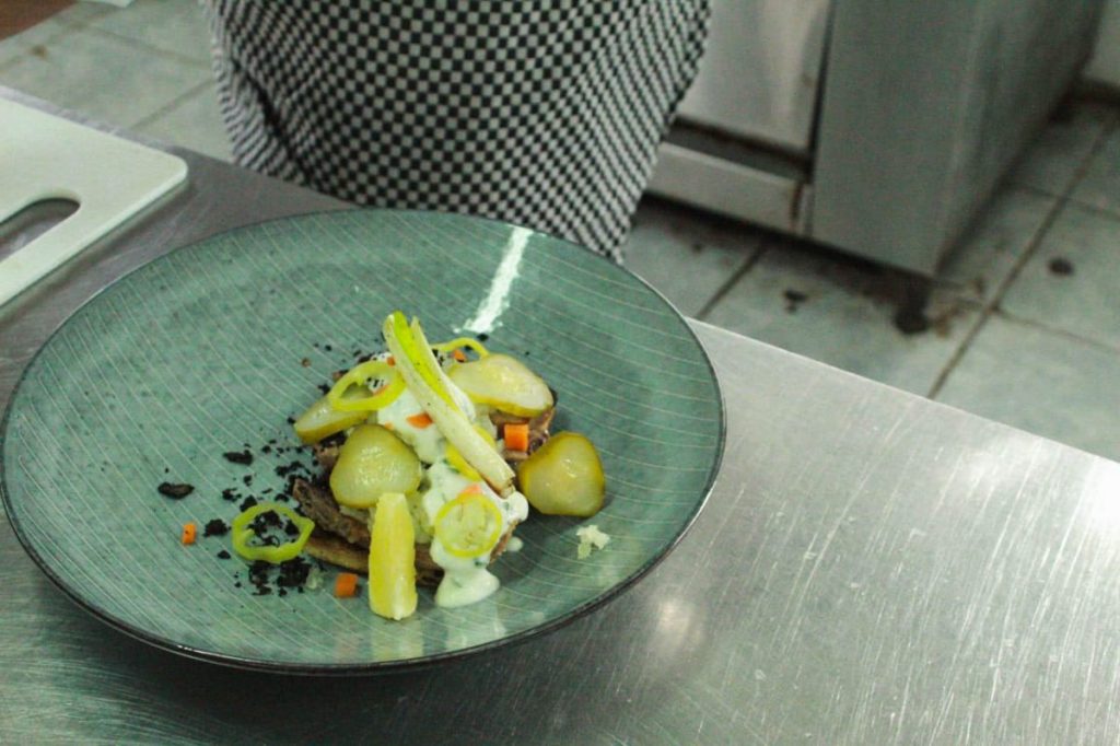 Lengua de vacuno sobre una tostada de “churrasca con ajo negro” y encurtidos como entrada