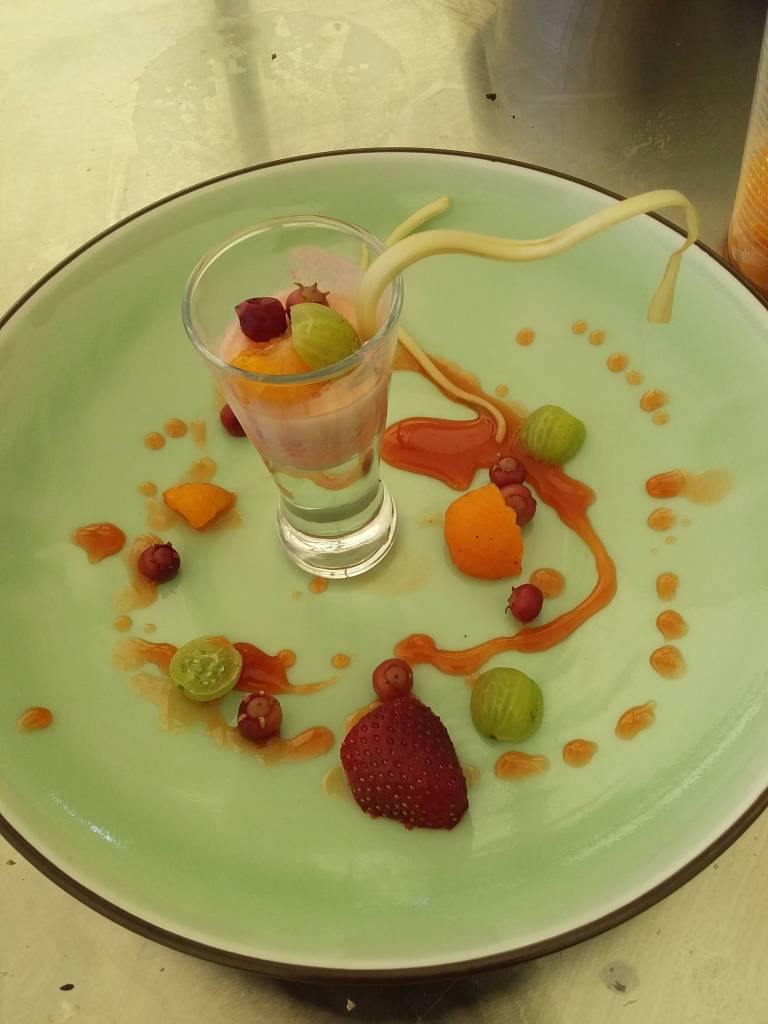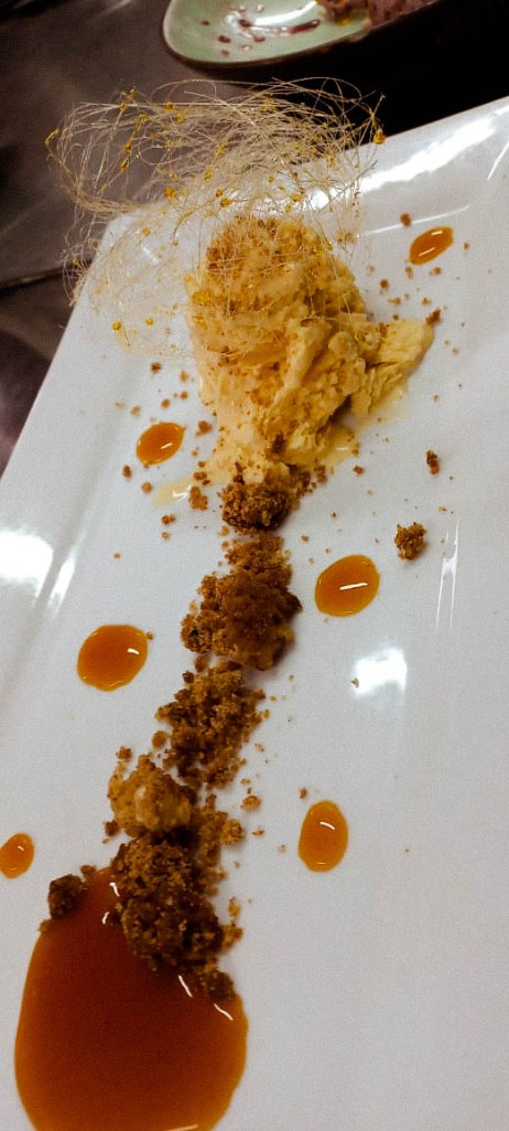 Helado de huesillos frutos rojos y tierra de mote como postre.